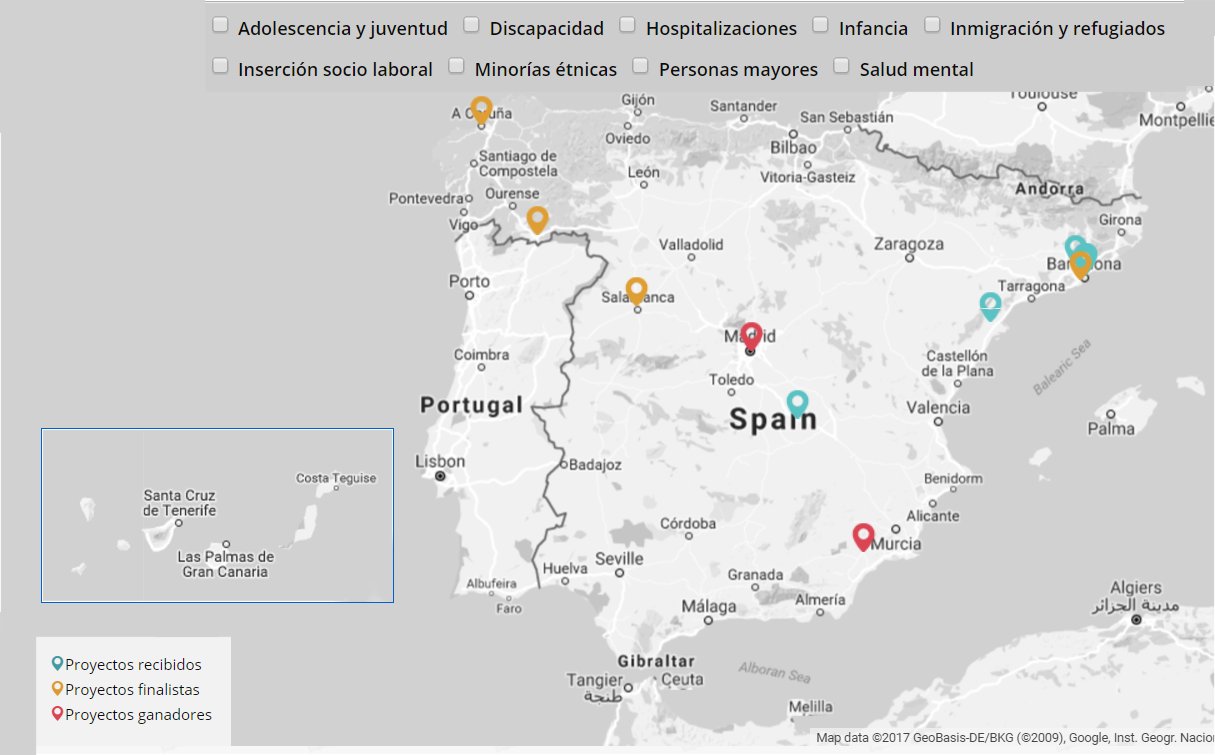 Mapa de proyectos presentados a las convocatorias. Obsérvese la clasificación temática del menú superior.